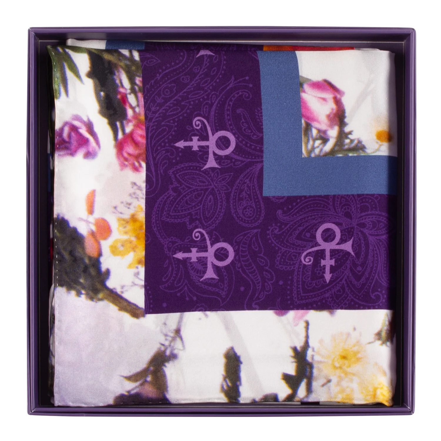This collectible Purple Rain face/floral scarf is 100% silk and measures 42" x 42".